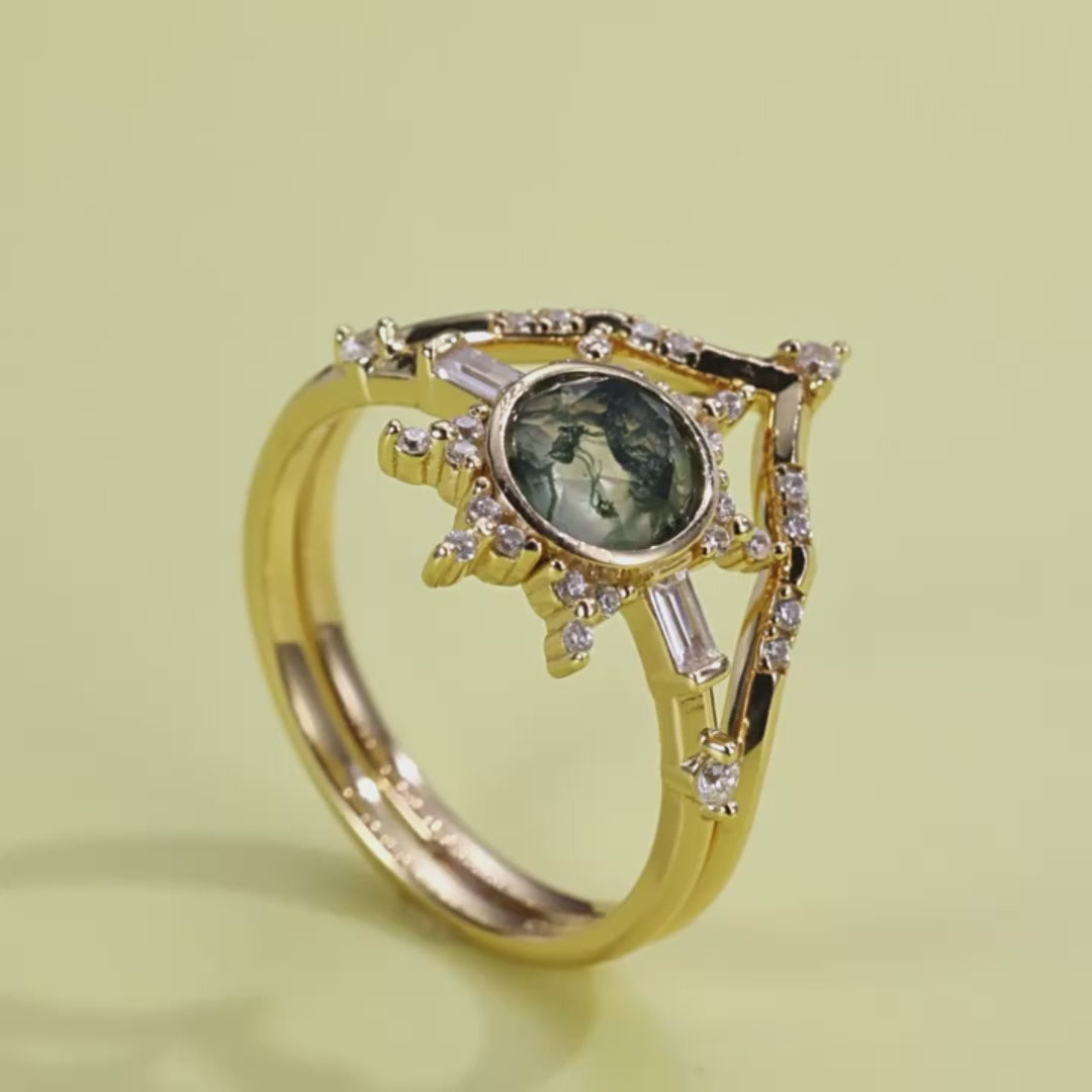 Embrace celestial beauty with this enchanting 10K gold plated ring set. The stunning centerpiece features a natural green moss agate with mesmerizing inclusions, set in an elegant sun-inspired design adorned with sparkling crystal accents. The matching curved band creates a harmonious pairing, with additional crystal stones adding brilliance to the sophisticated design.