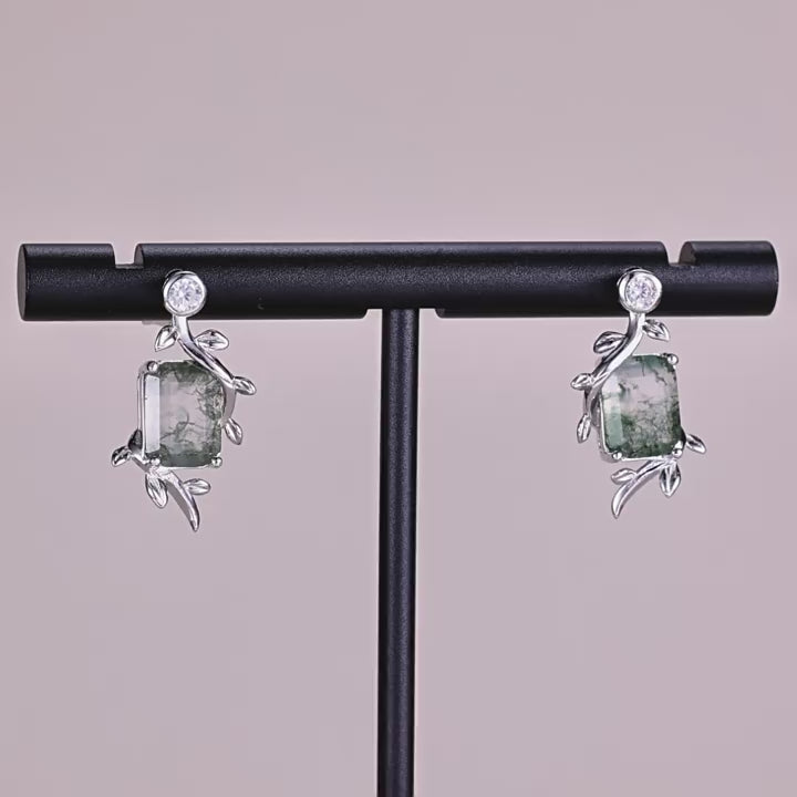 Sterling silver moss agate stud earrings with secure screw back closure, featuring botanical leaf design and natural garden inclusions,natural garden-inspired design.