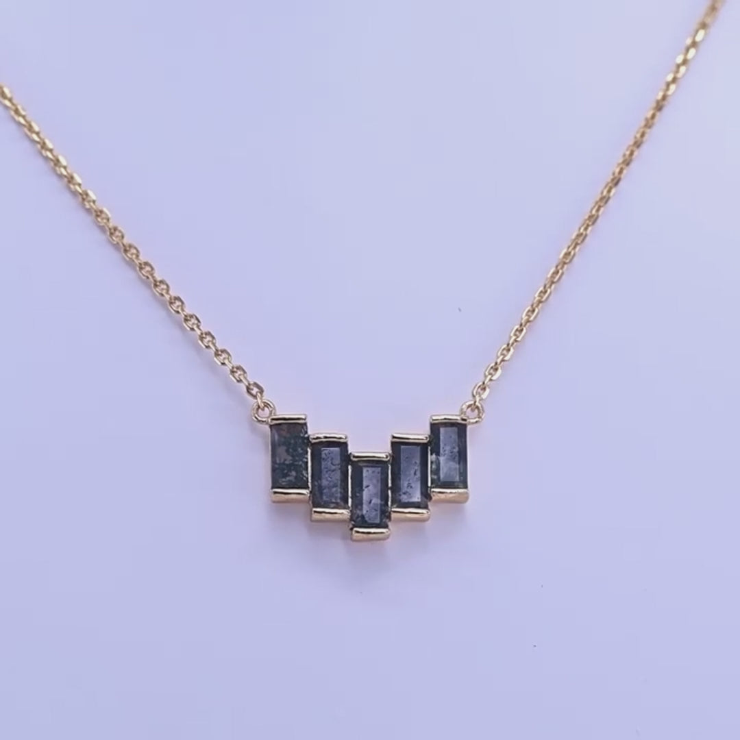 This 10K gold - plated necklace reimagines nature as architecture: five rectangular moss agates, their green veins pulsing like hidden woodland streams, rise in a tiered V - shape—echoing the bold geometry of 1920s skyscrapers. Each agate is a one - of - a - kind fragment of the wild, trapped in polished gold frames. The delicate O - link chain flows like liquid sunlight, framing the pendant’s architectural drama. Wear it as a bridge between eras: let the agates’ organic whispers harmonize with the gold’s glamorous pulse, turning every day into a runway of quiet rebellion.